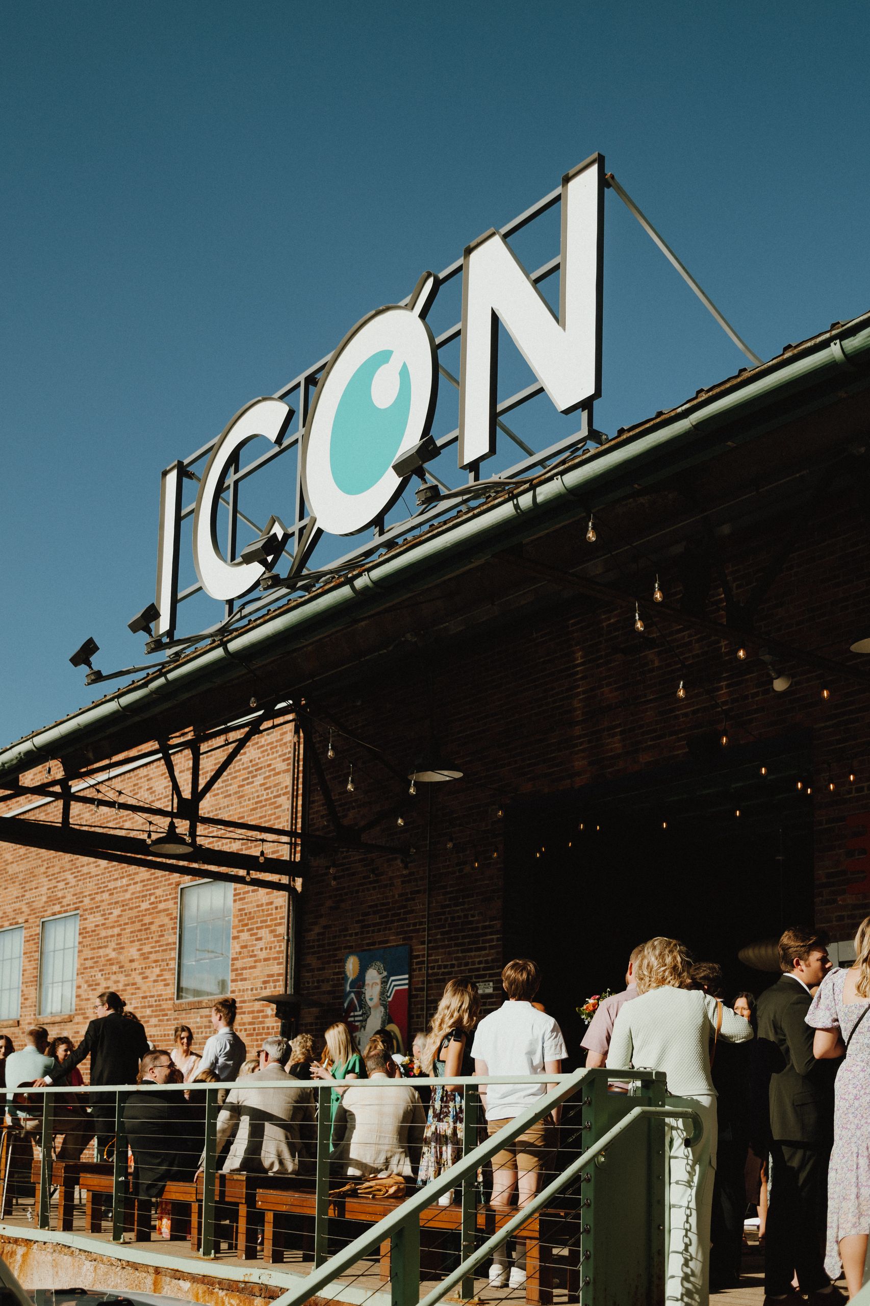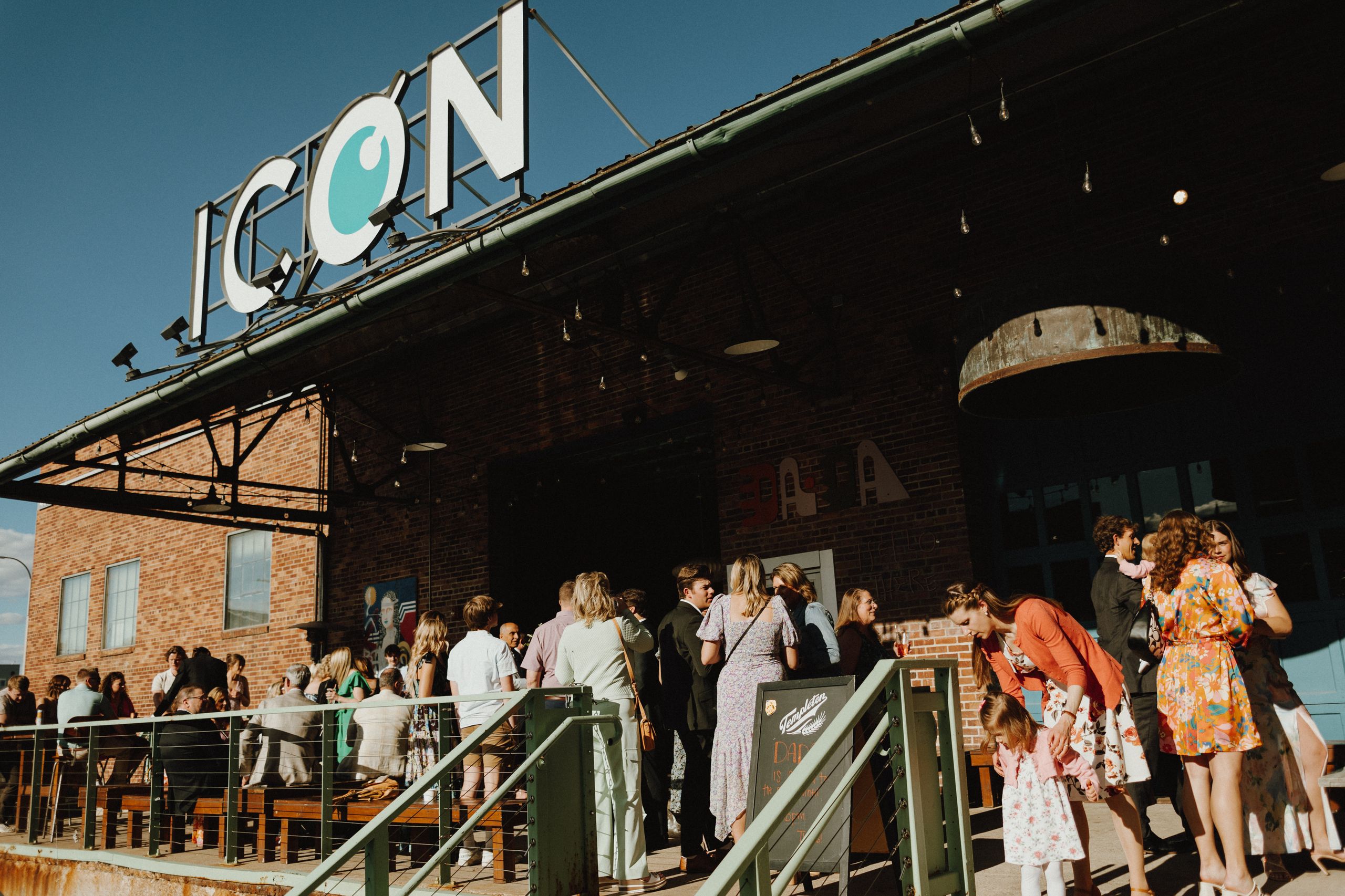 Guests enjoying cocktail hour at the couple’s celebration at ICON Event Hall, downtown Sioux Falls’ premier wedding venue. The outdoor patio provided a perfect backdrop for this moment. Photo credit: Lil Perspective...