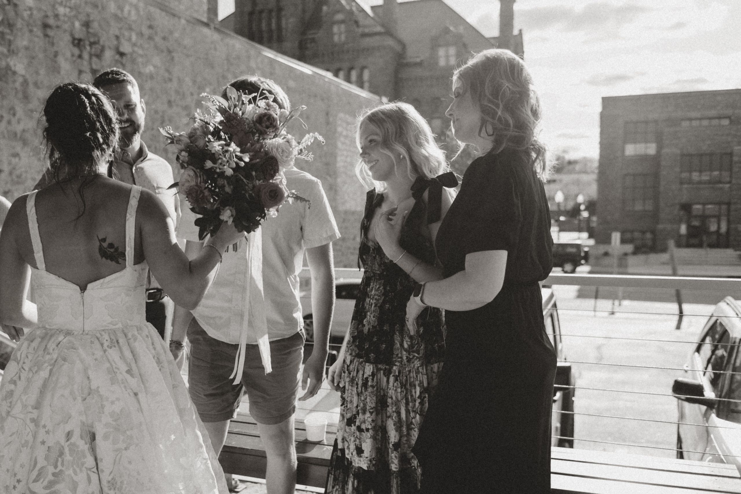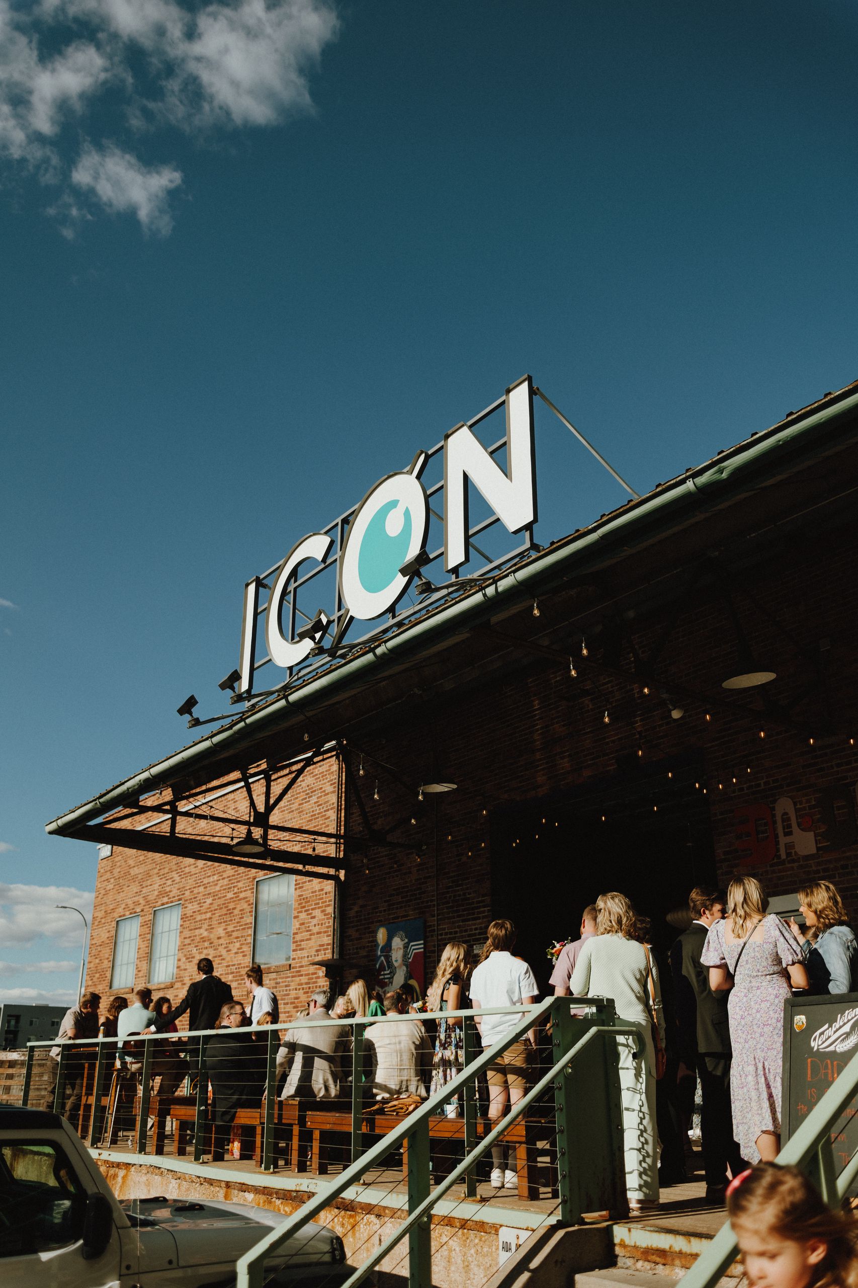 Guests enjoying cocktail hour at the couple’s celebration at ICON Event Hall, downtown Sioux Falls’ premier wedding venue. The outdoor patio provided a perfect backdrop for this moment. Photo credit: Lil Perspective...